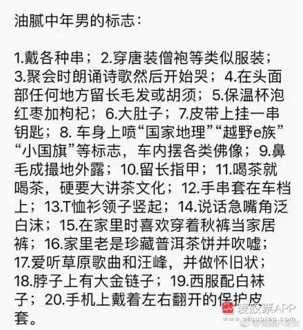 (泡泡特约)习近平的十九大讲话要求“精准扶贫”,官媒称其为“中国书写的最伟大的故事”。中文网络刷屏“油腻中年男”,各种讽刺段子乐此不疲。如果你仔细观察下就能发现,刷“油腻中年”的人中并不存在能被习近平定位为“精准”的被扶贫对象,而真正贫困的人连上微信的手机都买不起;再看看“油腻”的特征,手串、唐装、枸杞子、金链子、普洱茶、私家车……这说的明显是中产,而与年龄无太大关系。理解为年龄歧视的都错了,它只是不平等的阶层差异之妒恨的一种伪装。