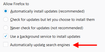 最后,您可能希望确保Firefox使您的默认搜索引擎保持您选择的状态(而不是恢复为Google)。为此,请转到菜单 > 选项 > 常规 > 允许Firefox,然后取消选中“自动更新搜索引擎”。