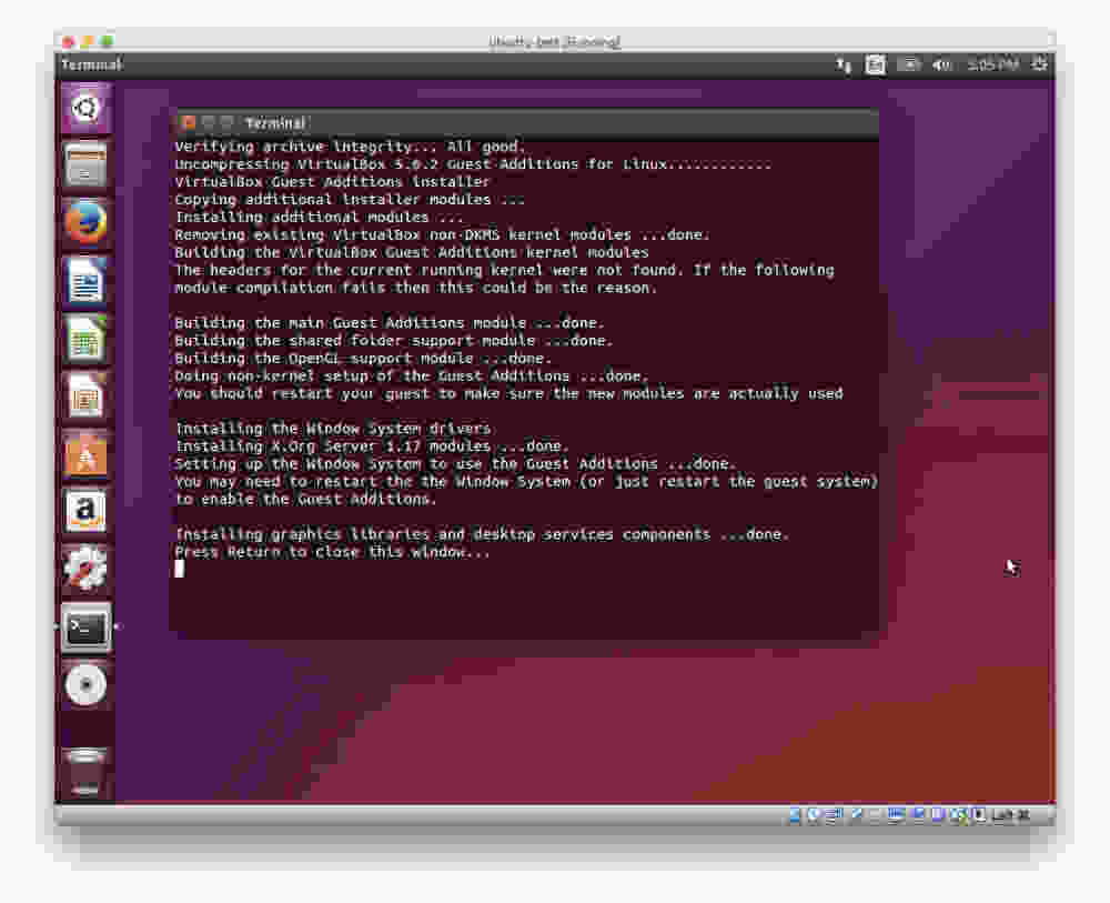 共享文件稍微复杂一些。首先,您需要将用户添加到 VM 中的“vboxsf”组(如果您不明白这意味着什么也不要担心)。单击左上角的 Ubuntu 徽标,键入“terminal”,然后单击 Terminal 图标以在 VM 中打开终端。然后输入: