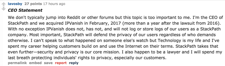 That court case was from 2016 – long before StackPath acquired IPVanish in 2017. IPVanish does not, has not, and will not log or store logs of our users as a StackPath company. We can't speak to what happened on someone else's watch, and that management team is long gone. In addition to not logging, StackPath will defend the privacy of our users, regardless of who demands otherwise.