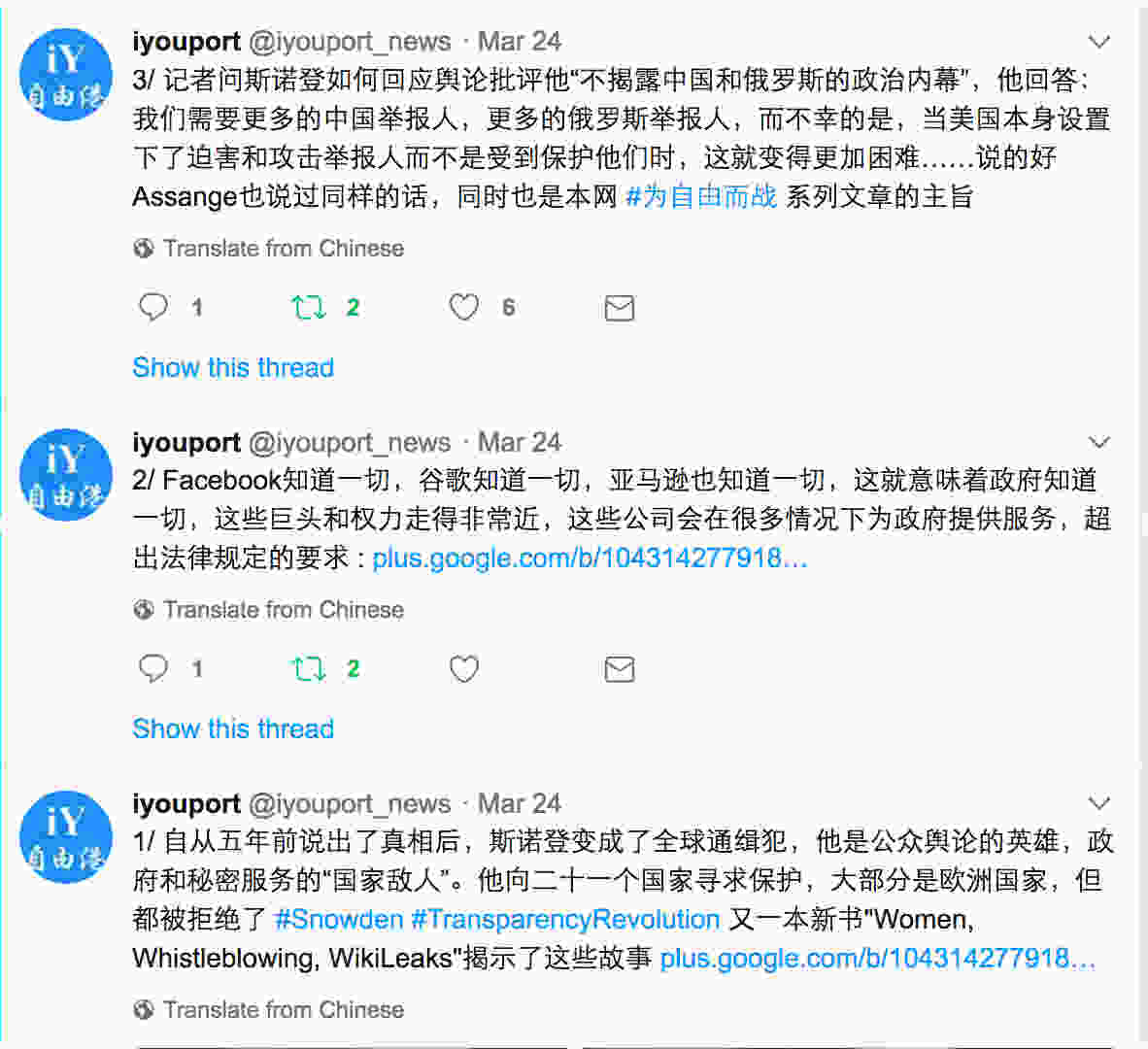 可能已经没人记得当年 Google 离开中国很多中国人去献花的时候,我说过什么。现在想起来当年我的话并不透彻,但八年过去了,如今仍有很多中国人会抱怨我当年的话。就在上周,我们关于 Snowden 的报道被 Google+ 屏蔽的消息,收到了来自多位中国不同领域名人的怪异的反馈,他们说“外国公司怎么也会这样”?(潜台词是“这不可能”)我不知道该如何回复。脑补了一篇上万字的论文之后,什么也没说。