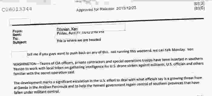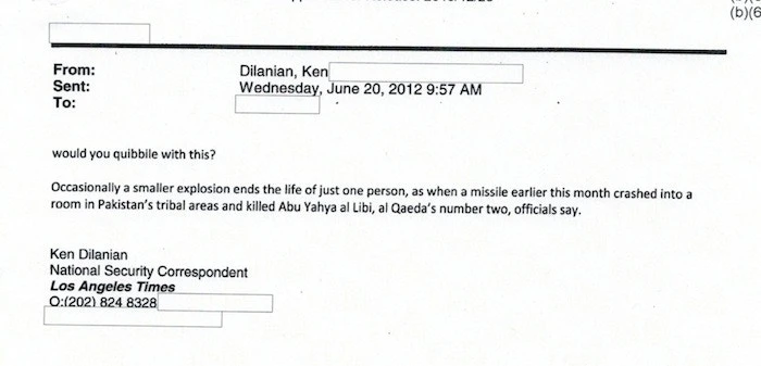 Dilanian 的电子邮件被纳入 FOIA 的一项请求,寻求 2012 年3月至7月间中央情报局和10位国家安全记者之间的沟通,这些记者和作家包括:Dilanian, Adam Goldman(原在美联社,现在在华盛顿邮报)Matt Apuzzo(原在美联社,现在纽约时报)洛杉矶时报的 Brian Bennett,华尔街日报的 Siobhan Gorman,纽约时报的 Scott Shane 还有华盛顿邮报专栏作家 David Ignatius。这些通信都被公开了。