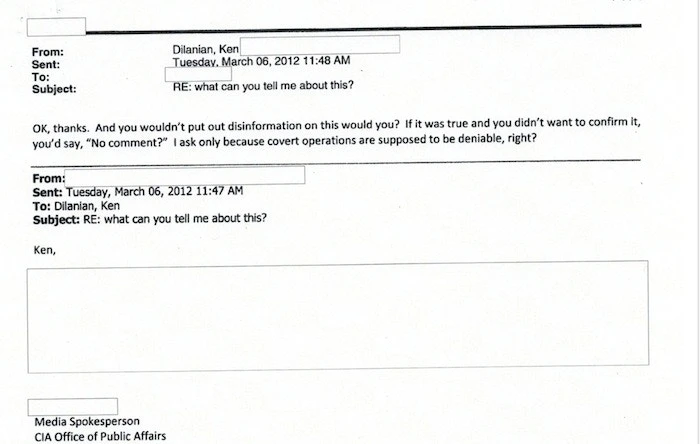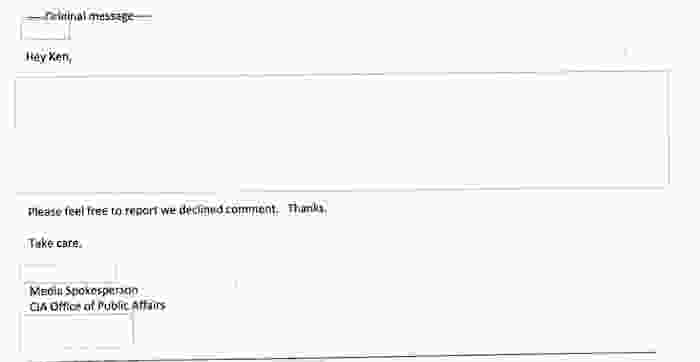 不可能准确知道中央情报局对记者的询问是如何回应的,因为公开的电子邮件只显示对话的一方。但显然,中情局修改了几乎所有回复,除了在记录中明确提出的微薄评论之外,引用 1949 年的 CIA 法案,该法令豁免该机构不得不披露的 ”情报来源和方法“ 或 “机构雇用的组织,职能,姓名,职位,薪水或人员数量。” 来自中央情报局新闻处理员的非正式记录或背景电子邮件的内容显然不公开姓名、头衔或薪水(无论如何都可以轻易地进行编辑); 他们可能会披露资料来源和方法,具体取决于您是否将操纵美国记者的行为视为“情报手段”。